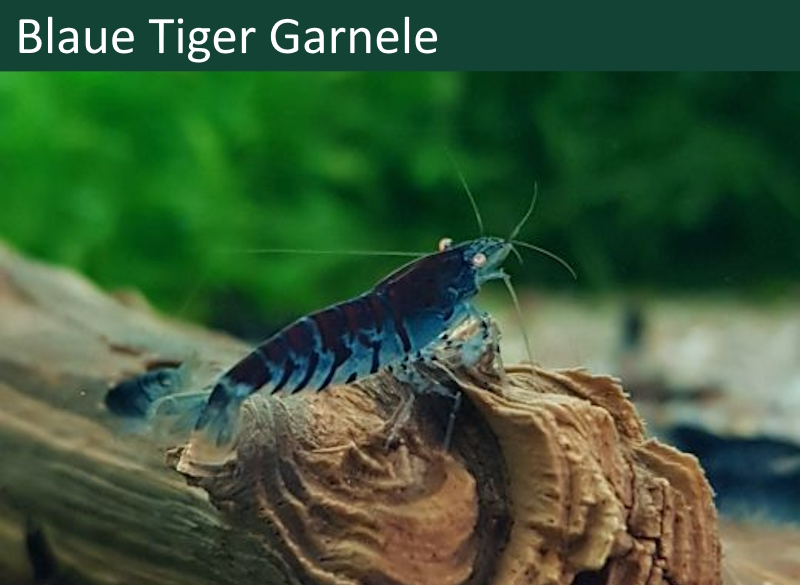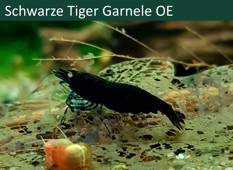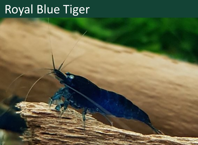 Wie die blaue Tigergarnele OE (Farbform von hell bis dunkel blau mit orangefarbenen Augen), die schwarze Tigergarnele mit orangenen Augen sowie die Form mit dunklen Augen und die Royal Blue ( intensiv flächige Königsblaue Farbform ohne Tigerstreifung mit orangenen Augen).