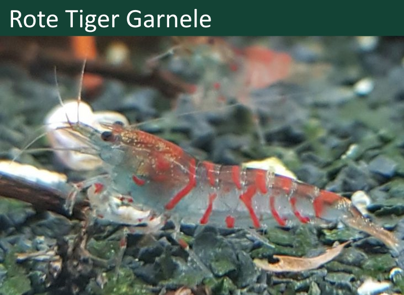 Eine weitere Wildform ist die rote Tigergarnele mit dünnen tiefroten Querstreifen auf heller Grundfarbe. Auch von der roten Tigergarnele existiert eine Zuchtform mit orangenen Augen.